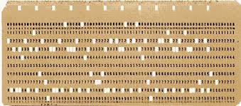 TARJETAS PERFORADAS: ficha de papel manila de 80 columnas, de unos 7,5 cm (3 pulgadas) de ancho por 18 cm (7 pulgadas) de largo, en la que podían introducirse 80 columnas de datos en forma de orificios practicados por una máquina perforadora. Estos orificios correspondían a números, letras y otros caracteres que podía leer un ordenador equipada con lector de tarjetas perforadas.